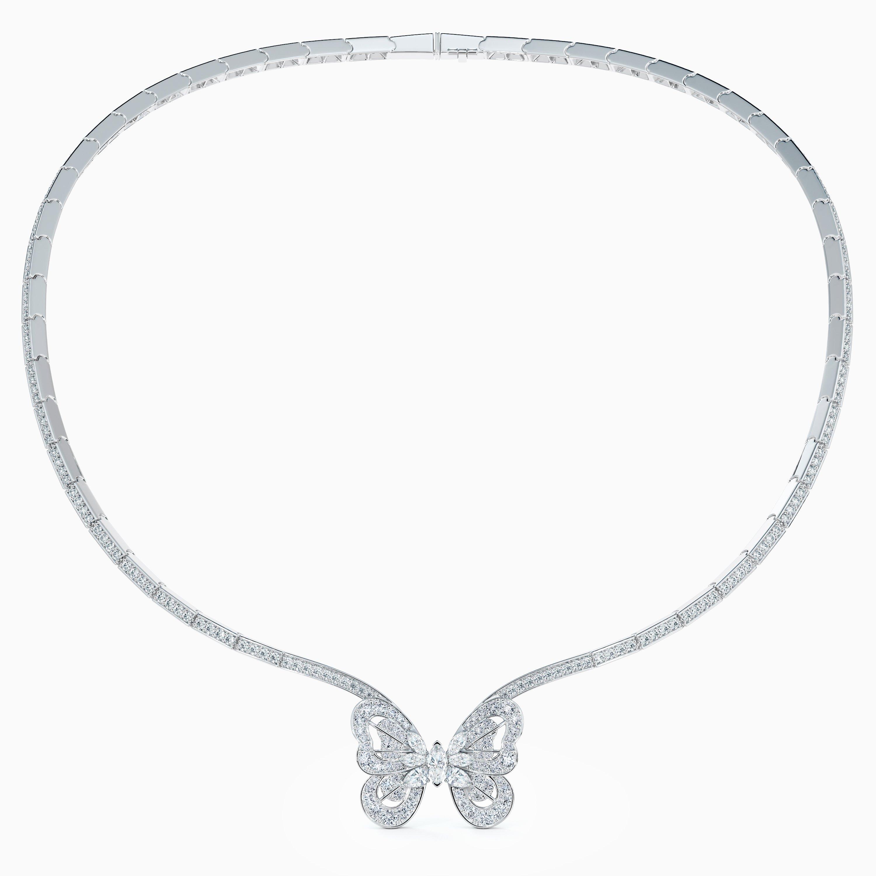 A timeless 18K white gold necklace, a curving line of white micropavé-set diamonds seamlessly segues into the wings of the butterfly. Rich in detail, the pendant features a marquise-shaped diamond and delicate openwork design which allows natural light to travel through the wings, resulting in exceptional sparkle from every angle. The total weight of the diamonds in this piece is ~4.81 carats.