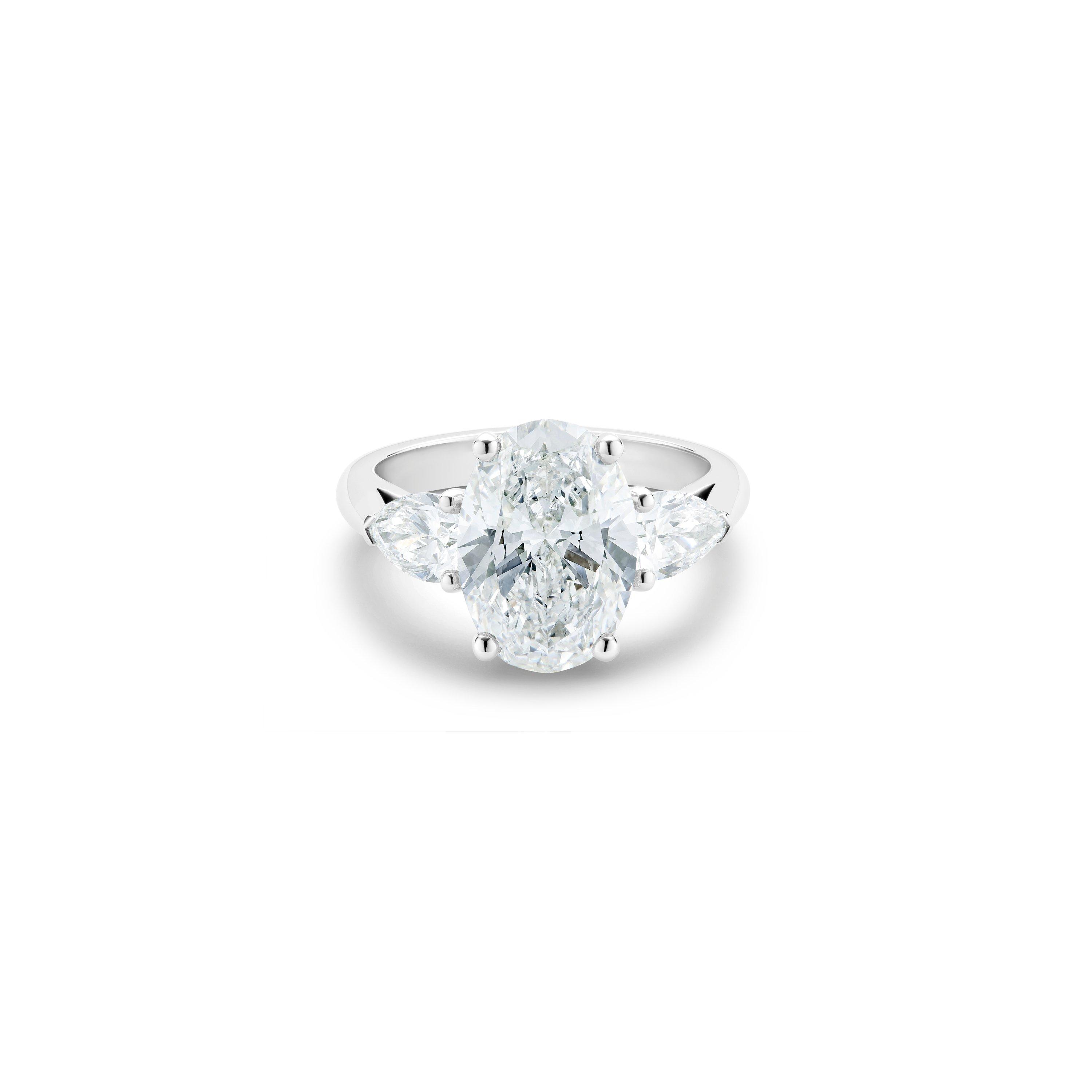 這款鉑金鑽石戒指體現了橢圓形切割永恆和優雅的風格。重約3.01克拉的中央主鑽兩側為兩顆梨形鑽石,鑽石總重約3.85克拉。 在De Beers,我們悉心甄選出最稀有的鑽石。汲取130多年的專業經驗,只有最具特色的鑽石方可成為我們經典設計的一部分。 就如同我們所有的珠寶作品,此款戒指的每顆鑽石都以手工整齊排列,突顯了中央主鑽的火光、生命力與亮光,使戒指燦耀生輝。