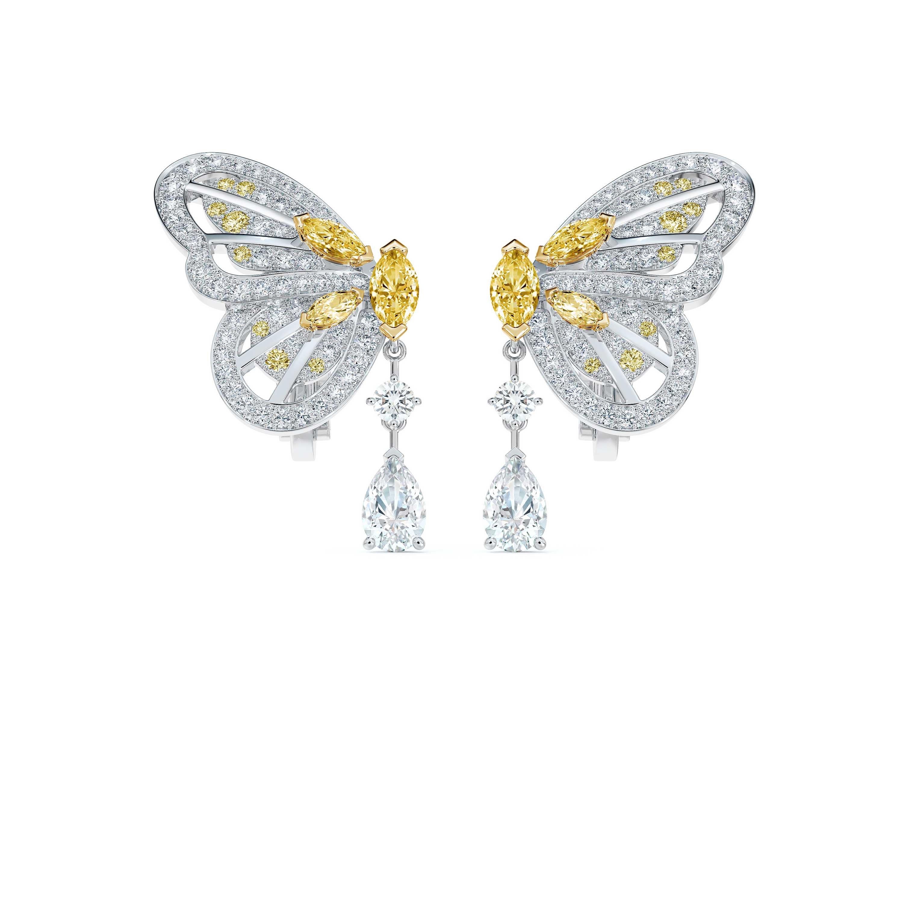 這對充滿玩味的耳環,靈感源自蝴蝶的蛻變天性,以及蝴蝶翅膀反射光線的虹彩。每只耳環中,重約0.50克拉及0.51克拉的梨形鑽石吊墜可以隨心拆下,任由佩戴者隨意搭配。總重約3.92克拉的美鑽鑲嵌於18K白金和黃金之上,圓形明亮式、欖尖形和梨形切割的黃鑽閃耀著天然亮光,與白色鑽石互相輝映,更顯蝴蝶翅膀的精緻美麗。